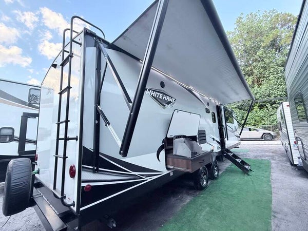 2019 jayco hawk, 38 ft pull behind with two slidesout ,weights 8900 libs ,full exterior kitchen ,walking cliset ,powered awning, this floorplan 32KBS is top of the line,high quality ,all functional ,cold ac ,really spacious room at front with king bed ,fireplace & bench