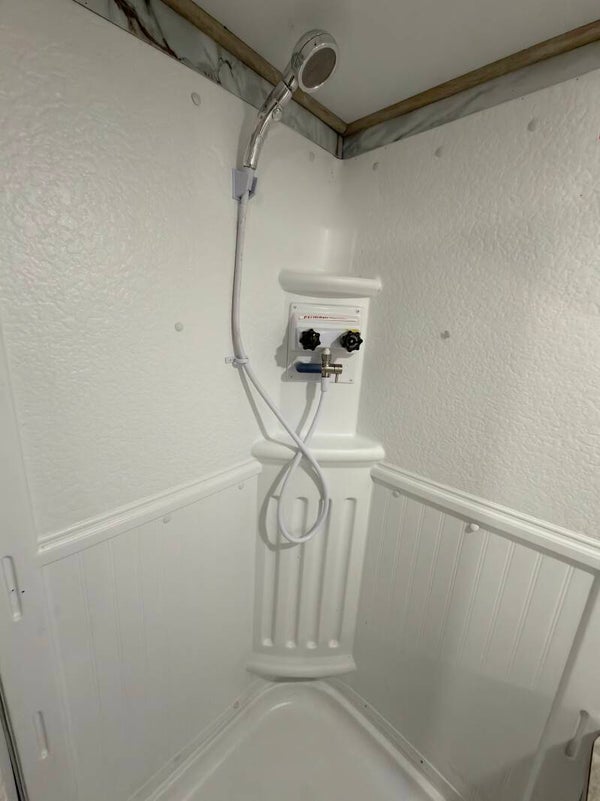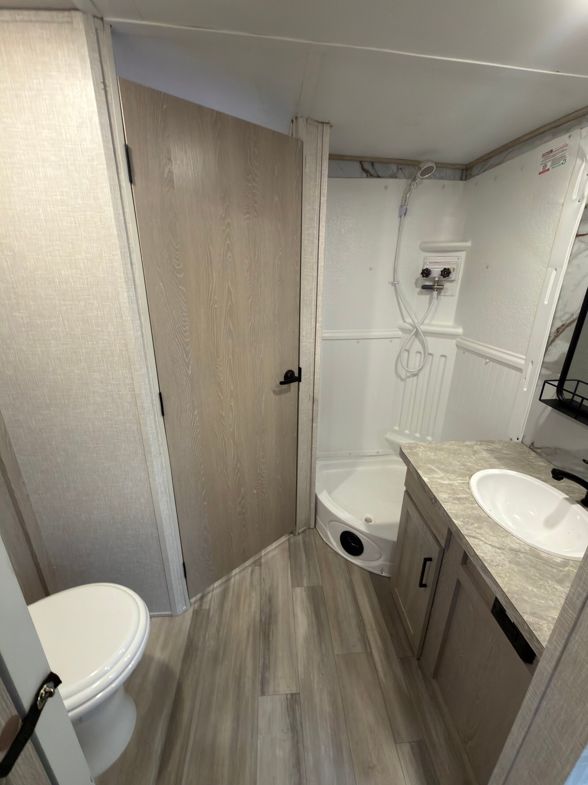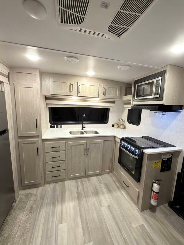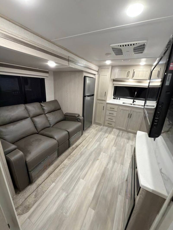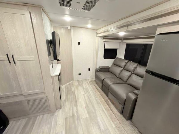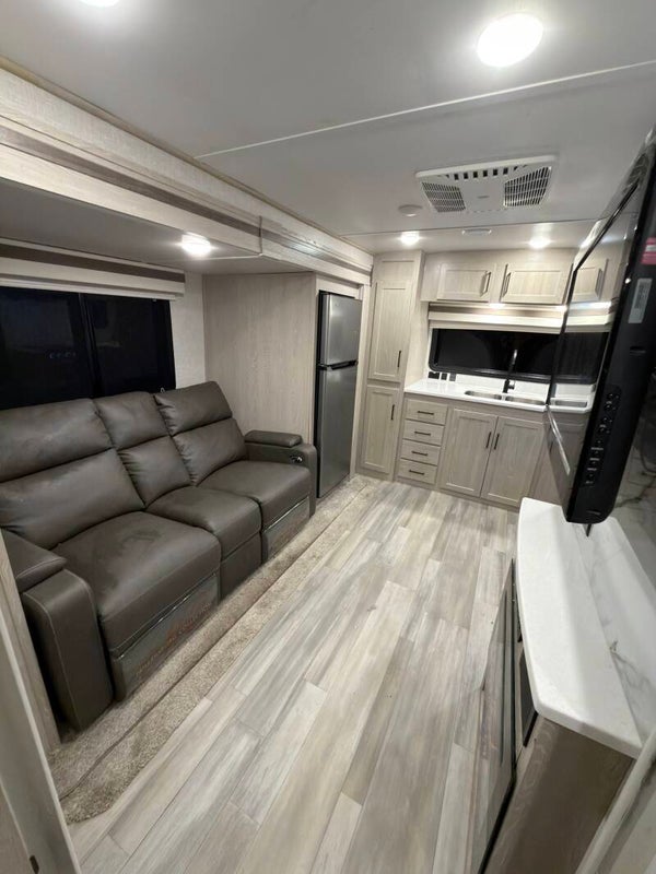 Este travel trailer de 26 pies cuenta con dos slide-outs, cocina frontal, baño tipo walk-through y cama queen residencial.