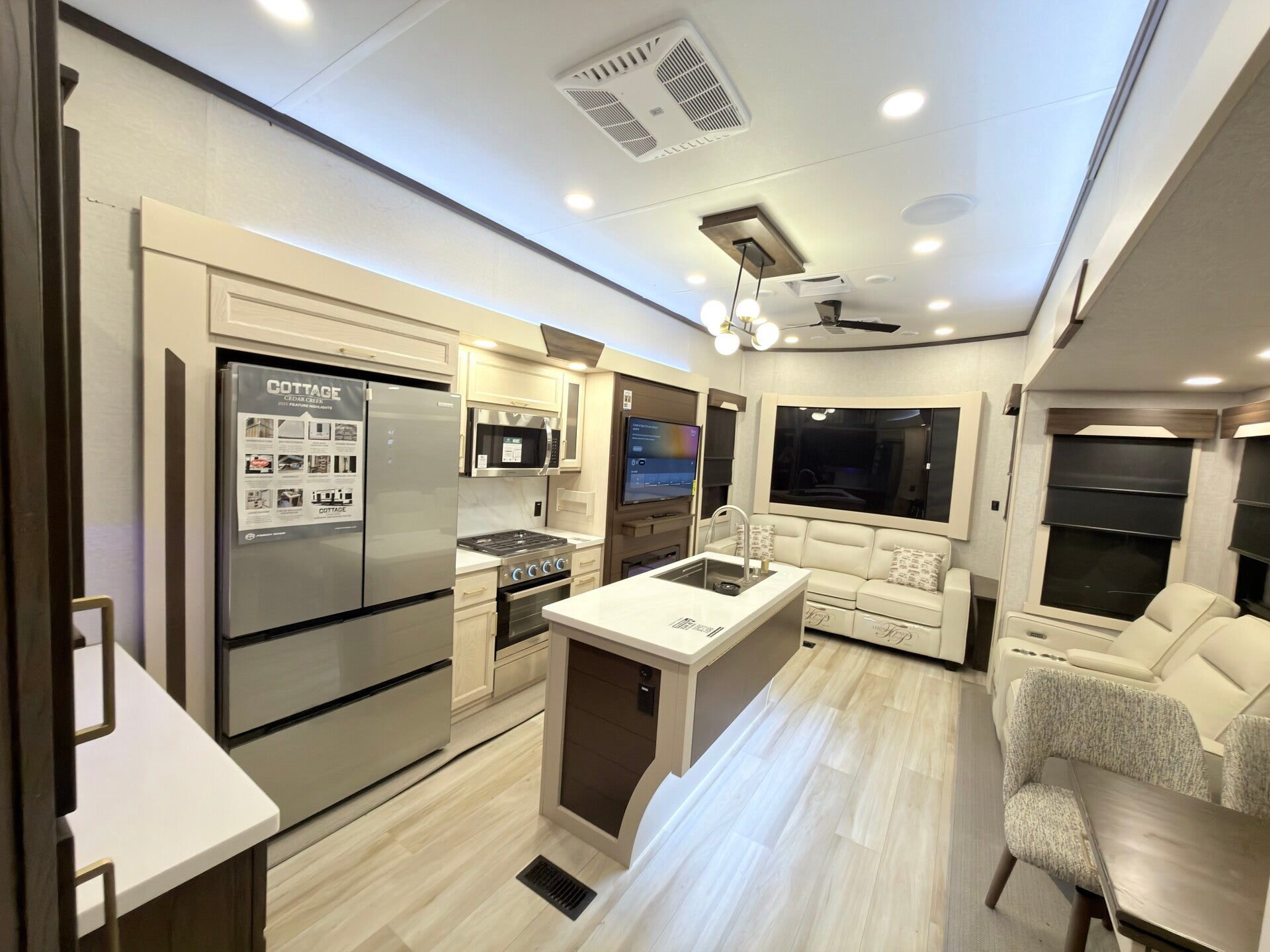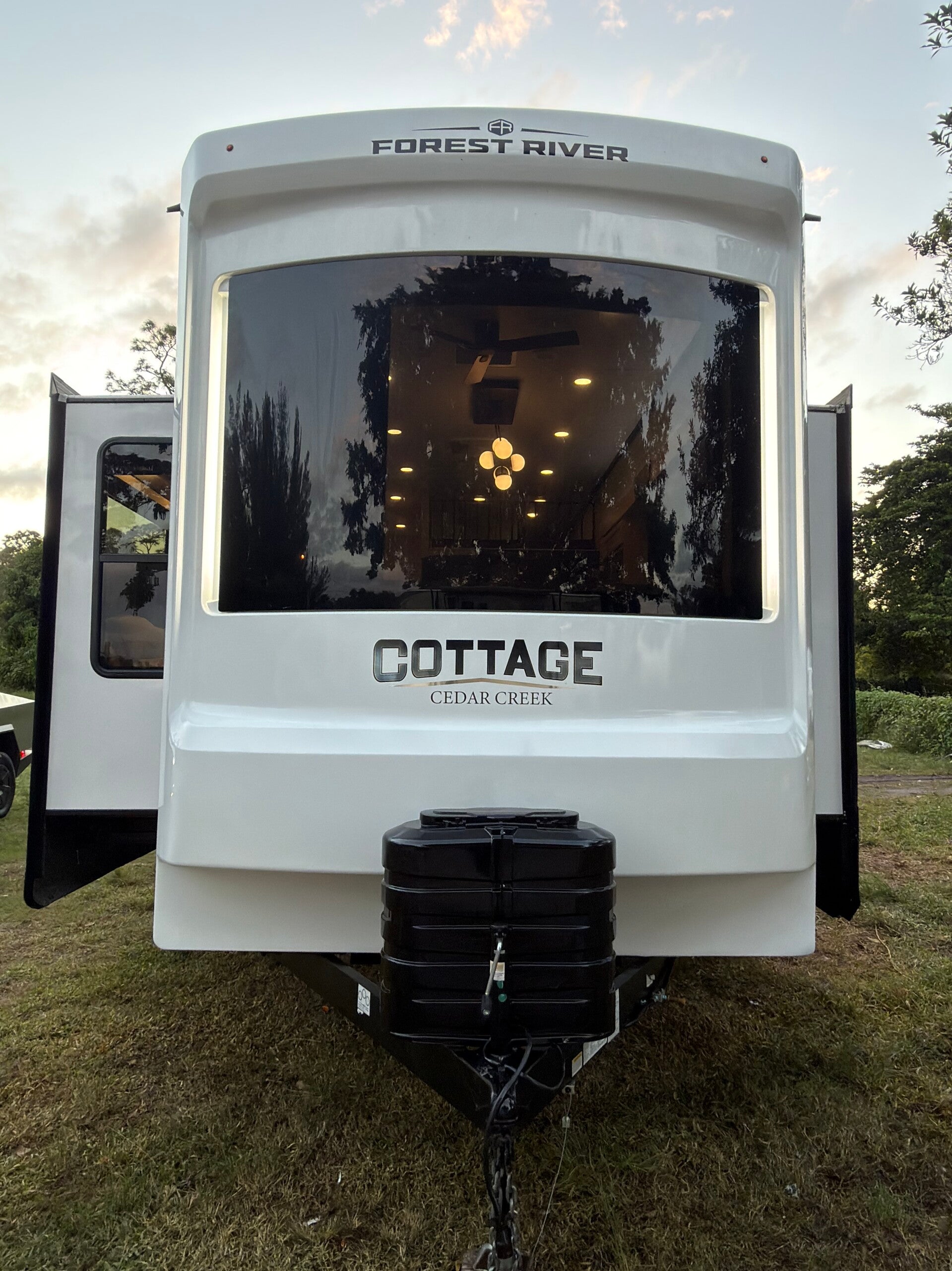 ...looking for a 2025 top of line unit,here up for sale is this 2025 Forest River Cedar Creek Cottage,floorplan 40CDL is a destination trailer with a GVWR of 13,615 lbs, a dry weight of about 11,954 lbs, and a cargo capacity of up to 1,921 lbs. It features a wide body, a loft with stairs, a large kitchen island with a flip-up counter, a king-size bed, and a prepped washer/dryer. Key construction details include an all-aluminum superstructure and TPO roof membrane, while comfort features include dual-panel patio doors and two 15,000 BTU air conditioners.