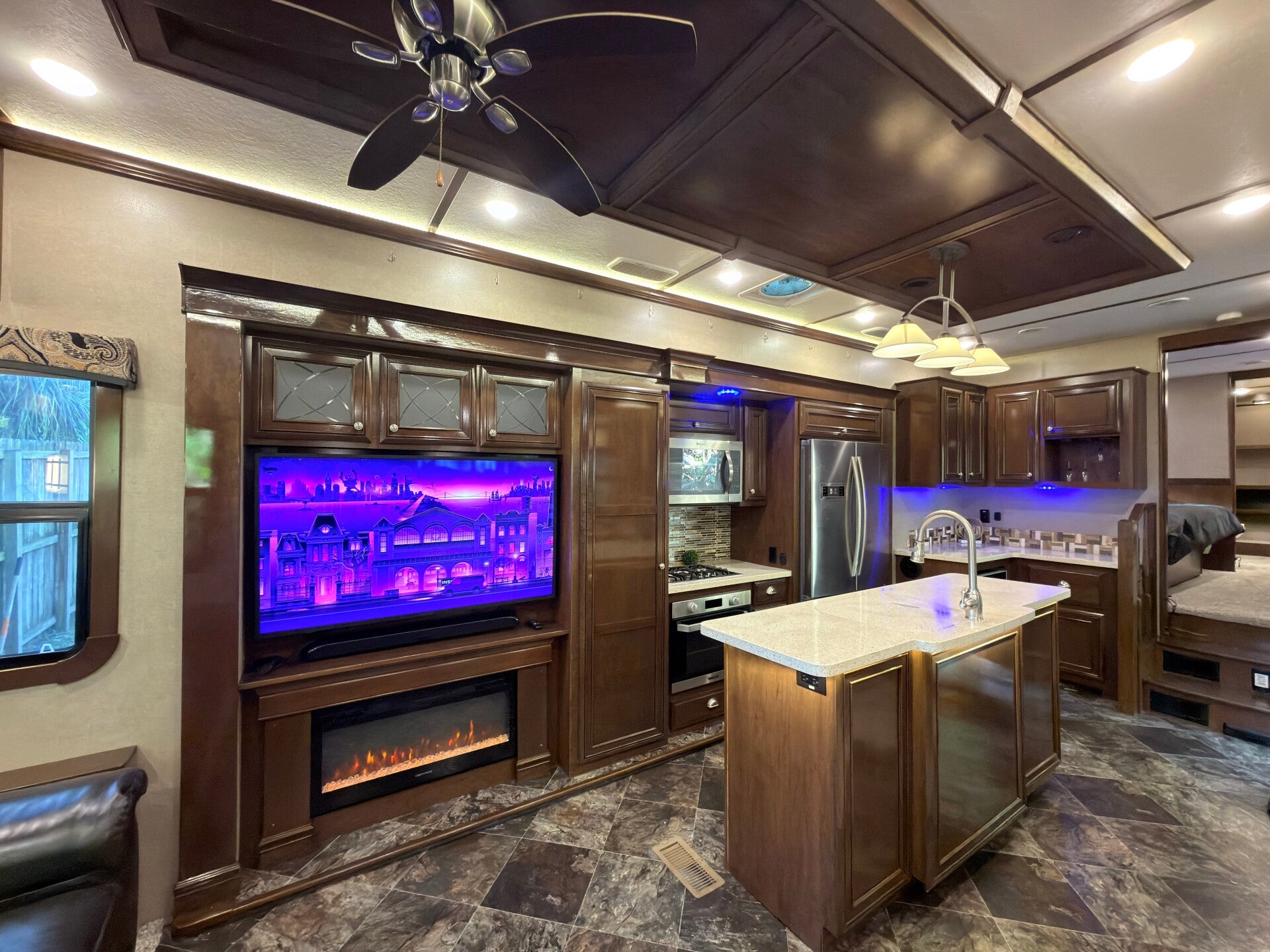 This 40 ft long fifth wheel features 3 slideout, top of the line carpentry all around including soft closing doors only high quality material used in this unit ! appliances like new