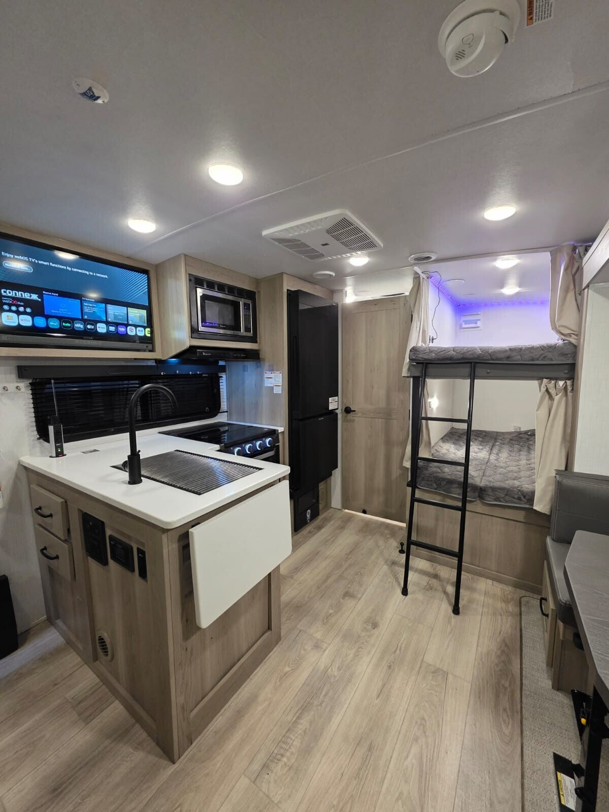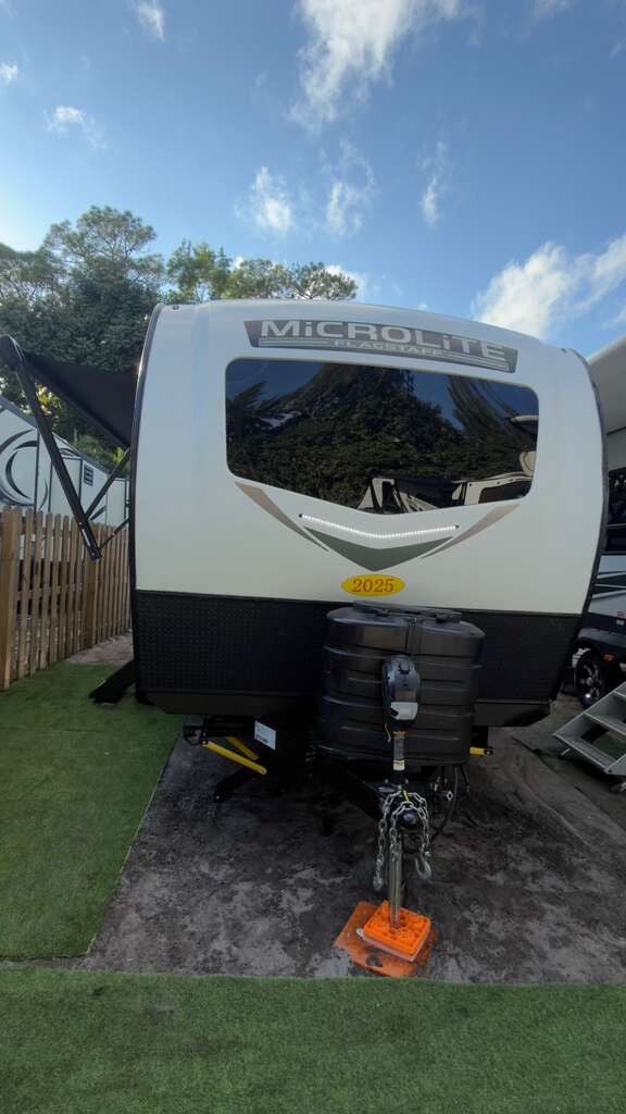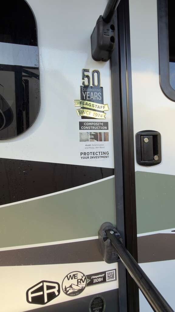 2025 Forest River Flagstaff Micro Lite 25DBH is a lightweight, 25' 10" travel trailer designed for family camping, featuring double-size bunk beds, a private front queen bedroom, and a single slide-out. With a dry weight around 5,794 lbs and GVWR of 7,580 lbs, it offers modern amenities including solid surface countertops, a 200W solar panel, and a 15,000 BTU AC